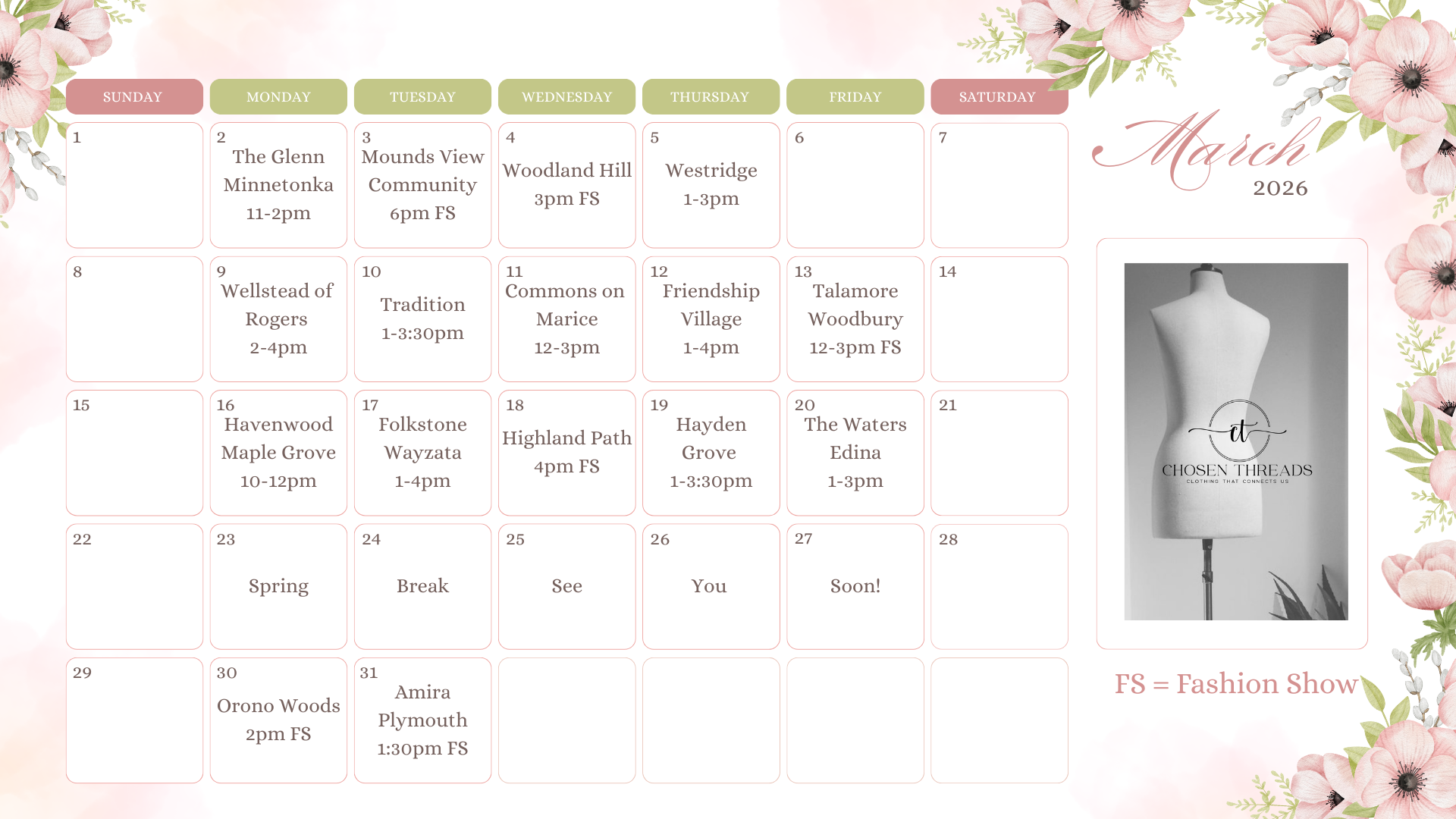 We make it simple! First, we partner with you to choose a date. Then, Chosen Threads designs personalized flyers to help promote the event. On the big day, we transform your community space into a beautiful pop-up boutique. Your models arrive, and our team styles them for the show.